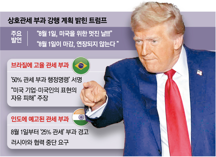 트럼프 대통령은 과거 신뢰 부족에서 벗어나 ‘스트롱맨’ 이미지로 회귀하며 8월 1일 관세 시한을 고수한다는 메시지를 전세계에 발신하고 있습니다. 브라질과 인도를 대상으로 고율 관세 행정명령을 단행하며 미국 무역정책의 정치적·경제적 결단과 압박 수위를 확대한 셈입니다. 이는 외교와 경제를 동시에 움직이는 복합 전략의 실험 무대라는 평가도 나옵니다.