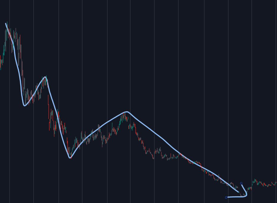 보시는 것과 같이 고점과 저점이 이전 고점과 저점보다 점점 낮아지고 있습니다. 이러한 추세를 하락 추세라고 합니다.