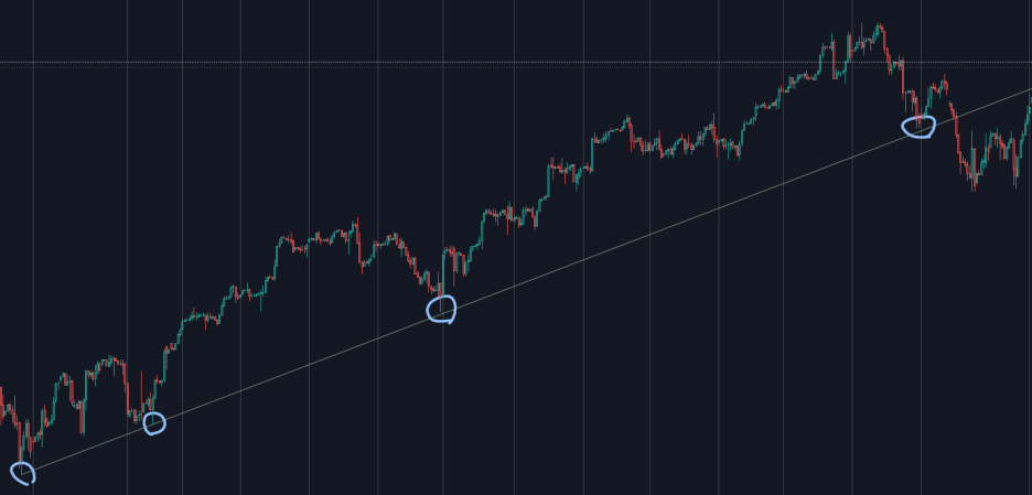 - 상승 추세선: 최소 두 개의 저점을 연결하여 상승 추세선을 그립니다. 이 선은 가격이 하락할 때 지지선 역할을 합니다.