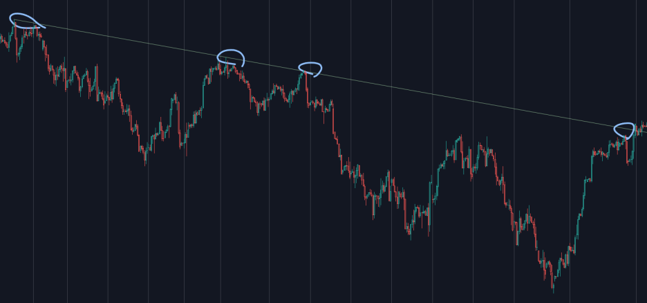 - 하락 추세선: 최소 두 개의 고점을 연결하여 하락 추세선을 그립니다. 이 선은 가격이 상승할 때 저항선 역할을 합니다.