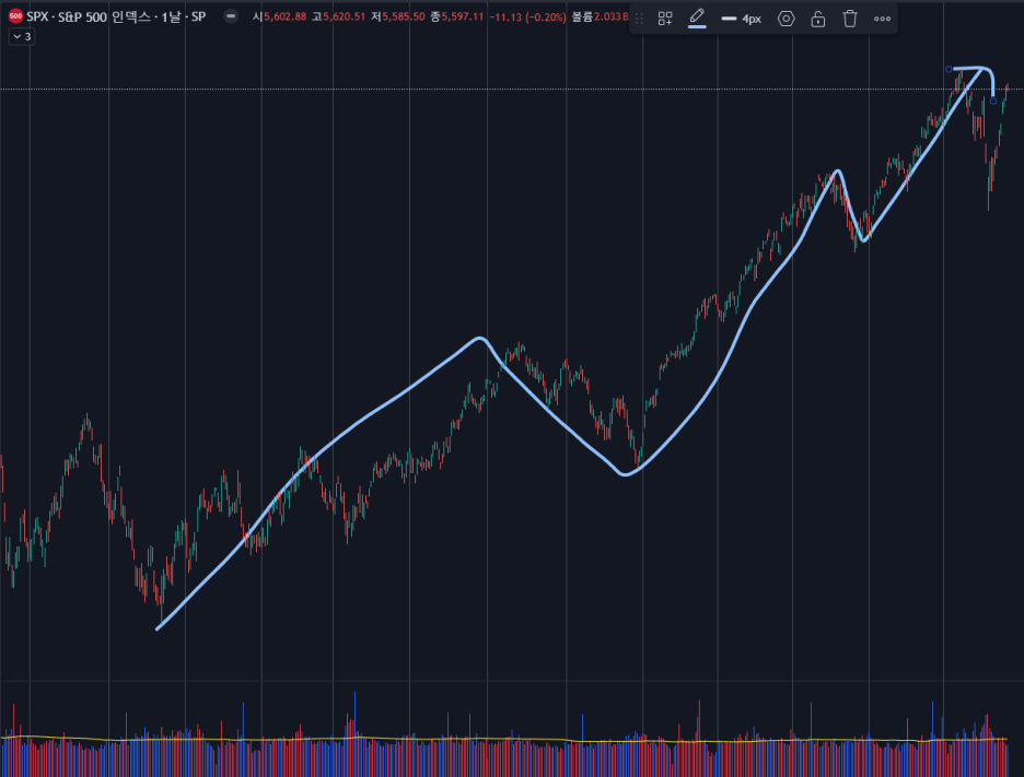 - 고점과 저점: 상승 추세에서는 고점이 이전 고점보다 높고, 저점이 이전 저점보다 높습니다. 이는 시장이 지속적으로 상승하고 있음을 나타냅니다.