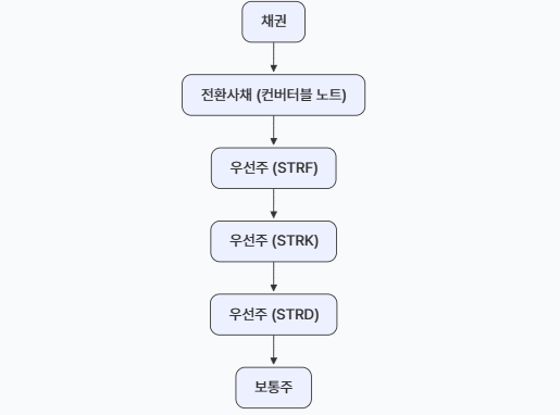 스트래티지의 경우를 보면, '컨버터블 노트'라고 불리는 전환사채가 가장 위에 있어요. 그 다음이 STRF, STRK, STRD순서로 우선주가 위치하죠. 같은 우선주라도 STRF가 가장 높은 순위에 있기 때문에 회사가 어려워져도 가장 안전하다고 볼 수 있어요. 그래서 원금 보전을 중요하게 생각하는 투자자들이 STRF 에 특히 관심을 많이 보인답니다. 아래 그림을 보면 이해하기 쉬울 거예요.